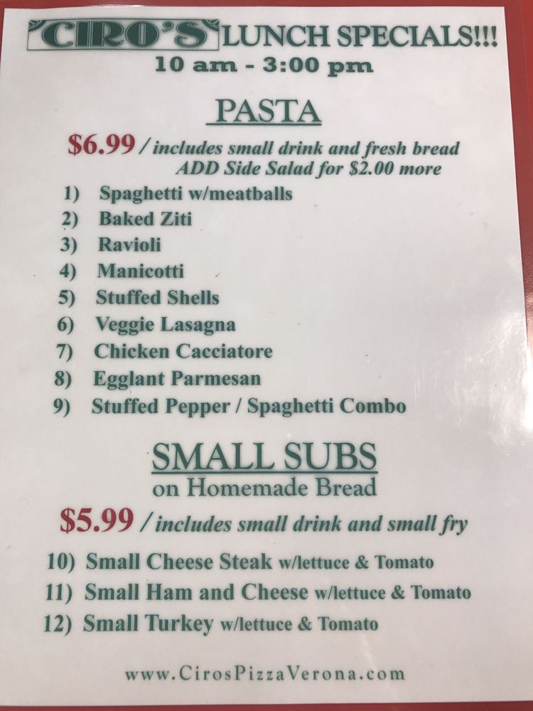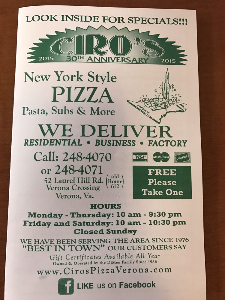 Welcome to Ciro's Pizza (Verona), a delightful haven for Italian cuisine enthusiasts nestled at 52 Laurel Hill Rd, Verona, VA. With a menu bursting with flavors, Ciro's specializes in authentic Sicilian pizzas, ranging from the classic Sicilian Cheese Pizza to the indulgent Sicilian Meat Lovers and Sicilian Buffalo Chicken. Each pizza is crafted with quality ingredients, perfectly baked to achieve that inviting NY-style crust.
